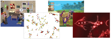 O primeiro jogo, que chamaremos de K@0Z & o.r-d.e.m, surgiu da proposta de criar um jogo de simulação de vida. Jogos deste estilo, como The Sims, SimVida, Spore, Pocket God ou Flow propõem que o jogador possa controlar a vida de seres (criaturas, pessoas, entre outros) em um mundo, seja tentando simular o mundo tal como “ele é” ou admitindo-se criar espaços ficcionais onde estes seres irão se desenvolver.